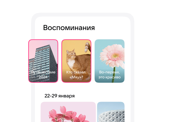 Наполните свои дни тёплыми воспоминаниями! Облако покажет истории с лучшими фотографиями и отметит на карте места, которые вы посетили. А ещё оно умеет распознавать людей и объекты, чтобы вы могли быстро найти все фото с ними